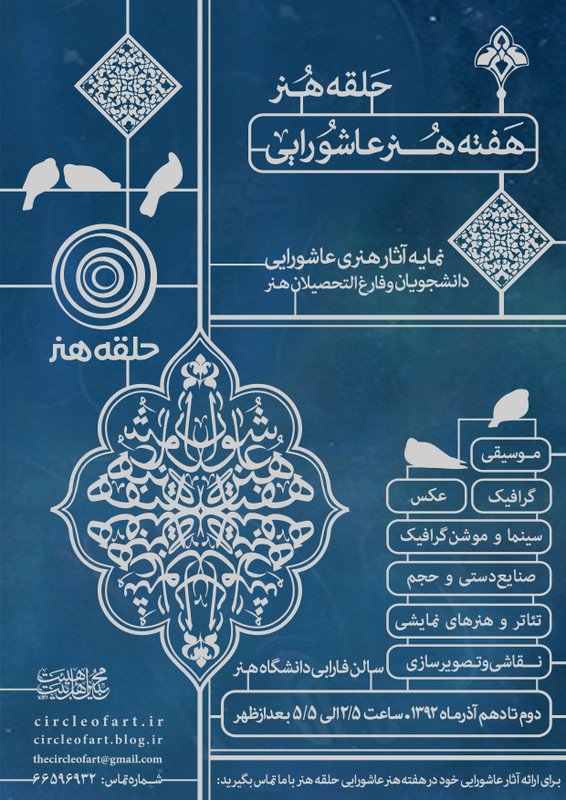 مکان برگزاری هفته هنر عاشورایی حلقه هنر: تهران، خیابان ولیعصر، روبهروی بزرگمهر، دانشگاه هنر، پردیس هنرهای کاربردی، سالن فارابی