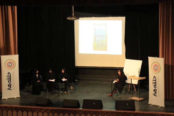 جلسهی پانزدهم حلقهی هنر، یک دهه مانده به اربعین حسینی، هنوز حال و هوایی عاشورایی داشت. آغاز جلسه همراه بود با پخش انیمیشن کوتاه ذوالجناح از هادی محمدیان و موضوع ارائهی این جلسه نیز عبارت بود از مجموعه سرامیک عاشورایی اثر خانم افهام مشهور. خانم مشهور، کارشناس ارشد رشتهی صنایع دستی، در آغاز جلسه توضیحات مفصلی راجع به برخی مفاهیم و نمادها راجع به پنجه و دست و رابطهی این اشکال و اعداد در فرهنگ و ادبیات و اسطورههای مسلمانان و سایر مردم جهان ارائه داد. در ادامهی توضیحات، مشهور اقدام به نمایش نکنک آثار این مجموعه کرد. او برای هر یک از تابلوهای سرامیکی خود پیشنیهای تاریخی را در هنر ذکر کرد و به توضیح تغییرات اعمالی خود و چهگونهگی شکلگیری ایده پرداخت. او همچنین توضیحاتی را در رابطه با مواد و تکنیکهای اجرا ارائه داد. پس از آن نیز حلقهی تحلیلی با حضور خانمها فاطمه خیر و نگار کفیلی به عنوان تحلیلگر و سارا اکبری به عنوان مجری-کارشناس برگزار شد.