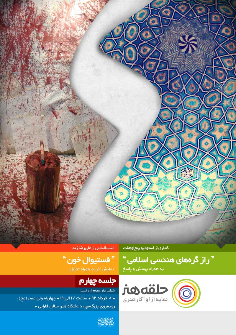 اجرای برنامه این هفته حلقه هنر بر عهده علی حیاتی، مسئول هیئت هنر بود. ابتدای جلسه با ارائه اینستالیشن «فستیوال خون» توسط علیرضا زند هنرمند جوان صاحب اثر توام با ناهماهنگی نور و صدای سالن همراه بود. پس از کمی توضیحات توسط علیرضا زند و نمایش تصاویر متعدد از اثر. با حضور تحلیلگران حلقه هنر خانمها فرزانه پزشکی و سارا اکبری در جایگاه حلقه تحلیل، تحلیل و بررسی اثر در مدت ۳۰ دقیقه برگزار شد و پس از آن کارشناسان به پرسشها و نظرات شرکتکنندگان پاسخ دادند. به دلیل تاخیر اولیه بدون زمان استراحت و با قول آنکه پذیرایی درون سالن انجام خواهد شد، ارائه گفتار تخصصی از استودیو پنجاوهفت توسط محمدحسین کسرایی (به نمایندگی از استودیو پنجاوهفت) با عنوان «راز گرههای هندسی اسلامی» با نمایش تصاویر متعدد و جذابی برگزار شد که مورد استقبال بسیاری از شرکتکنندگان قرارگرفت. در پایان نیز محمدحسین کسرایی و یحیی نوریان به پرسشهای حضار پیرامون موضوع گفتار نظری پاسخ دادند.